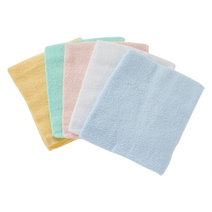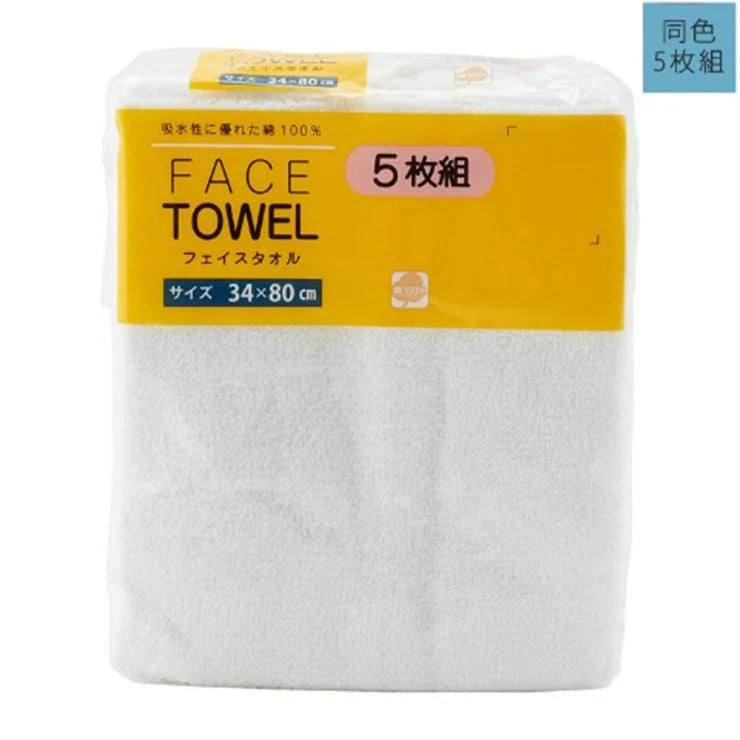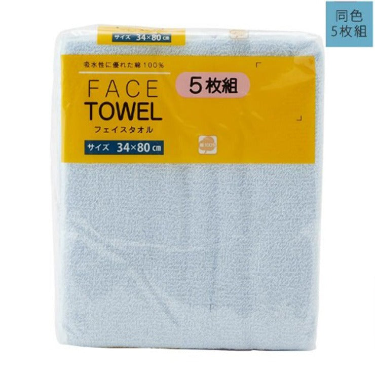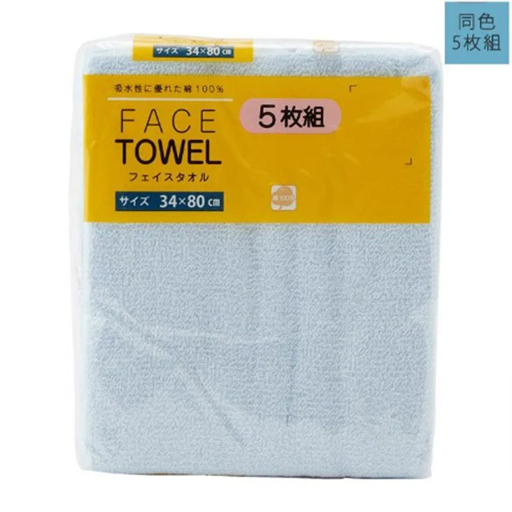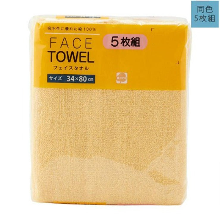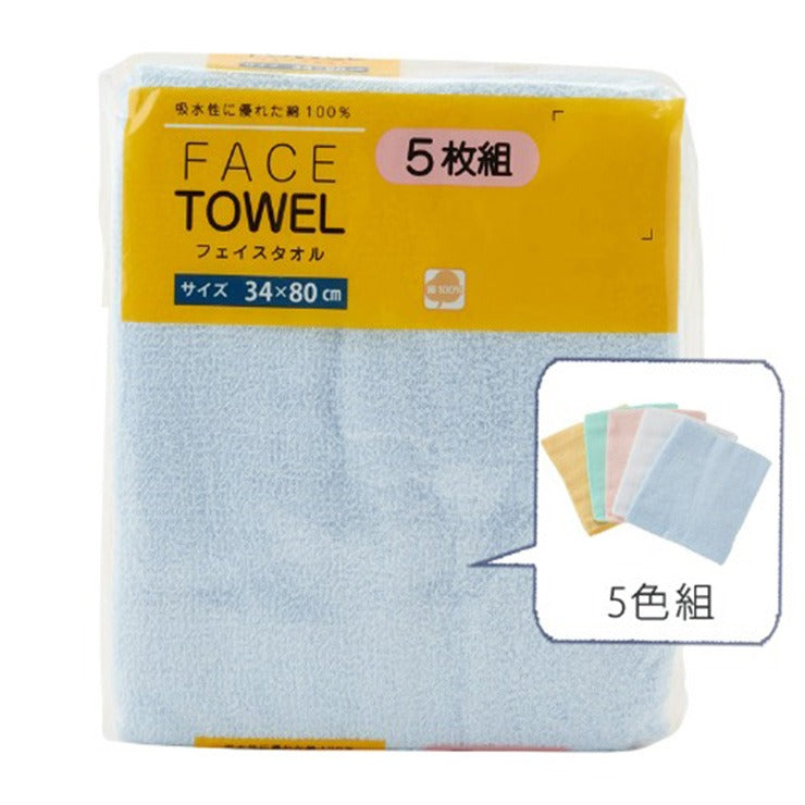 5枚組のお得なフェイスタオル。毛羽立ちが少なく絞りやすい風合いで大量使いに便利です。