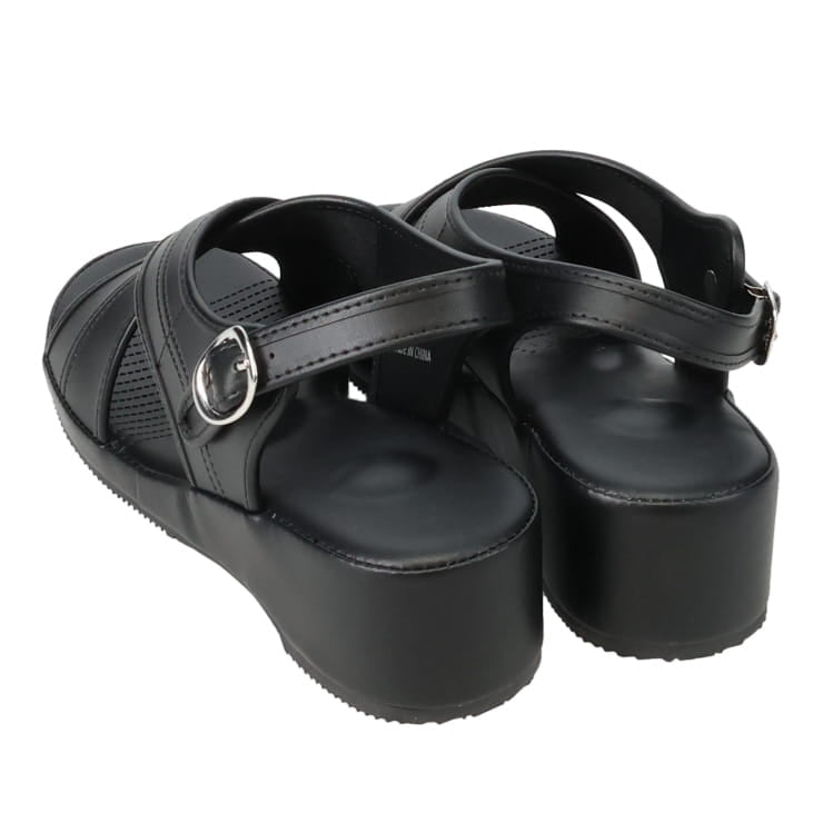 長時間の立ち仕事にも対応したクッション&安定感のあるヒール設計。クロスベルトが足元をしっかりホールドし、脱ぎ履きもラクラク。