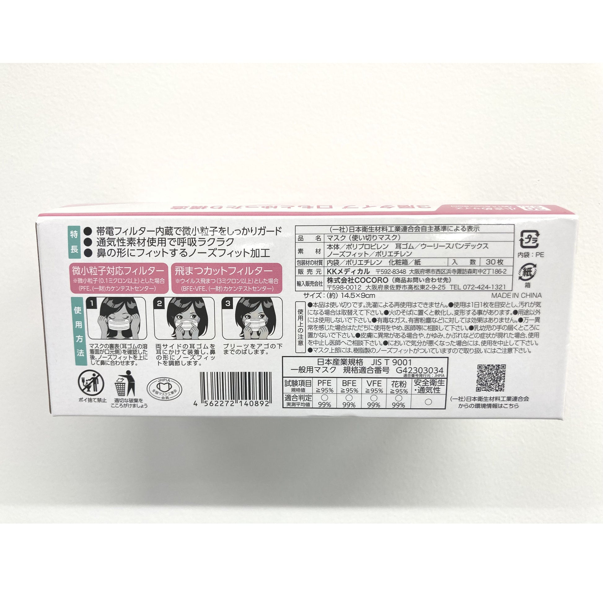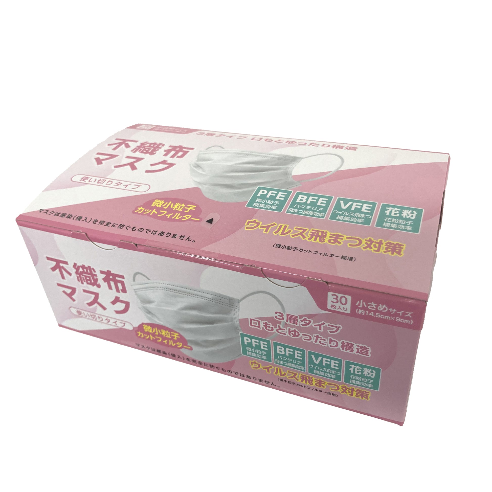 使い切りタイプのプリーツ不織布マスクです。3層タイプ・口もとゆったり構造。フィルター内蔵で微小粒子をしっかりガード。鼻の形にフィットするノーズフィット加工。