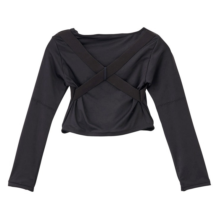 背中のクロステープが肩甲骨を”ぐっと”引き寄せて、 内に入った肩を後ろへサポート。