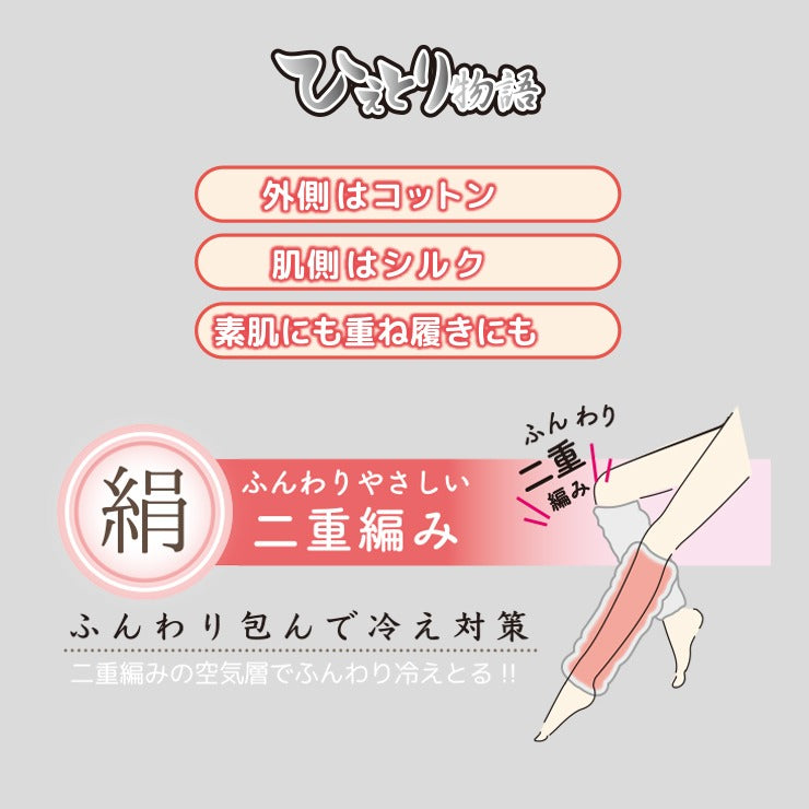 ロングセラー商品。表側に綿糸と肌にあたる内側に絹糸を使用し二重に編んだ空気層でふんわりとした冷え取りに好適なふんわり日本製レッグウォーマーです。