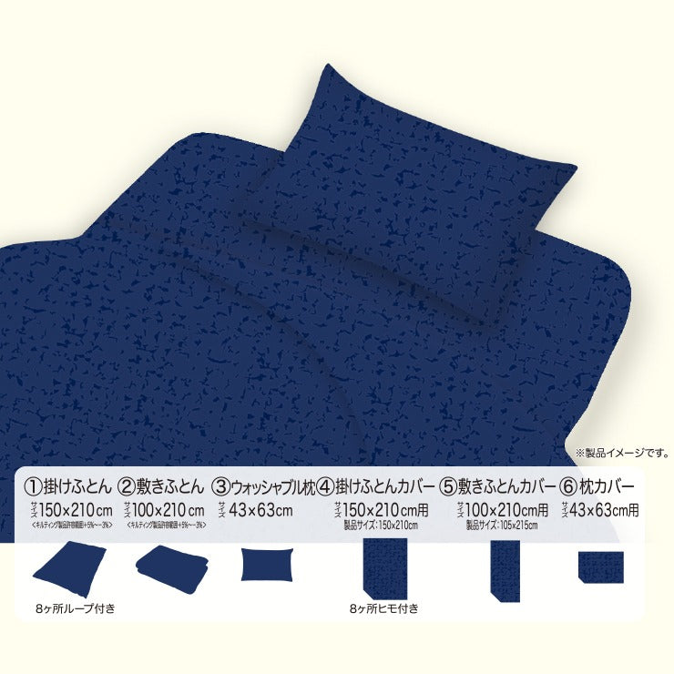 掛ふとん、敷き布団、まくらとそれらに付随するカバー3点がついたふとん6点セットです。